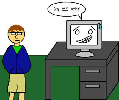 For today’s post I have included a illustration drawn in MSPaint by yours truly. Now to explain the story behind it. For those of you who don’t know, my occupation for the time being is a network administrator/computer tech guy for a small publishing company. Here’s a side story before I delve into the actual story. I’m sure that that job title sounds unfitting for an 18 year old. Well, the other day I went into the optometrist office to get my eyes checked out because I needed new glasses. Since I was a walk in patient I needed to fill out some paperwork. It was the normal name, address, phone, etc. They had a place for occupation so I filled it in with exactly what I just said my job was, network administrator. So, they sat me down in the chair with those huge super glasses with a million changeable lenses and the doctor walks in and starts with the normal small talk. He stops for a second and says well before we continue we will have to change some things on your paperwork. I wonder what it could be seeing that I am confident I know my name, address, and age. He has the nerve to say, “OK, for occupation you have network administrator, that’s your dad, not you.” What the hell? Why can’t I be one. So, I smugly told him, “No that’s me.” He was stunned and responded with, “O-ooo-oh that’s all then.” Jerk, showed him who’s boss. I always contend with my age and my computer knowledge. It pisses me off. I go to work on people’s computers, I get there they think I know nothing. I fix their computer and they are all stunned and always, always say “I didn’t think you could do that.” Geeze, don’t have too much faith in me.