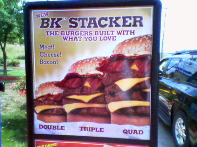 Do you guys notice anything horribly wrong with this picture. If you haven’t peek all the way to the right. Well, now our prayers have finally been answered! No more will we have to settle for the wimpy triple. In case the four meat patties were not enough, there is slices of bacon tossed up there on Mt.Heart Attack. Seriously what is wrong with restaurants and people. We are already the fattest and most unhealthy nation in the world, is our title in jeopardy or something? I think if you order that burger it should come with a free defibrillator. Actually, I changed my mind. If you order that burger you should be killed on the spot because apparently you don’t care enough about your well being and you’re pretty much killing yourself anyway. They try to make all these “healthy choices” in kids meals like oranges instead of fries and like yogurt or something then pull a stunt like that. In short, a big WTF to Burger King. On a side note I took that picture with my phone, and it looks really good. So, that’s pretty awesome. Moblogging here I come.