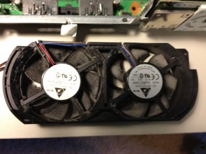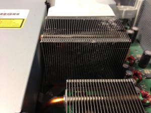 The first thing I noticed was the duty build up of the heat sinks. Dust is the enemy of computers. It kills fans and causes chips to overheat. This takes at least part of the blame for why it broke.