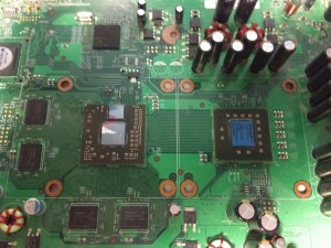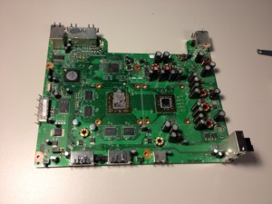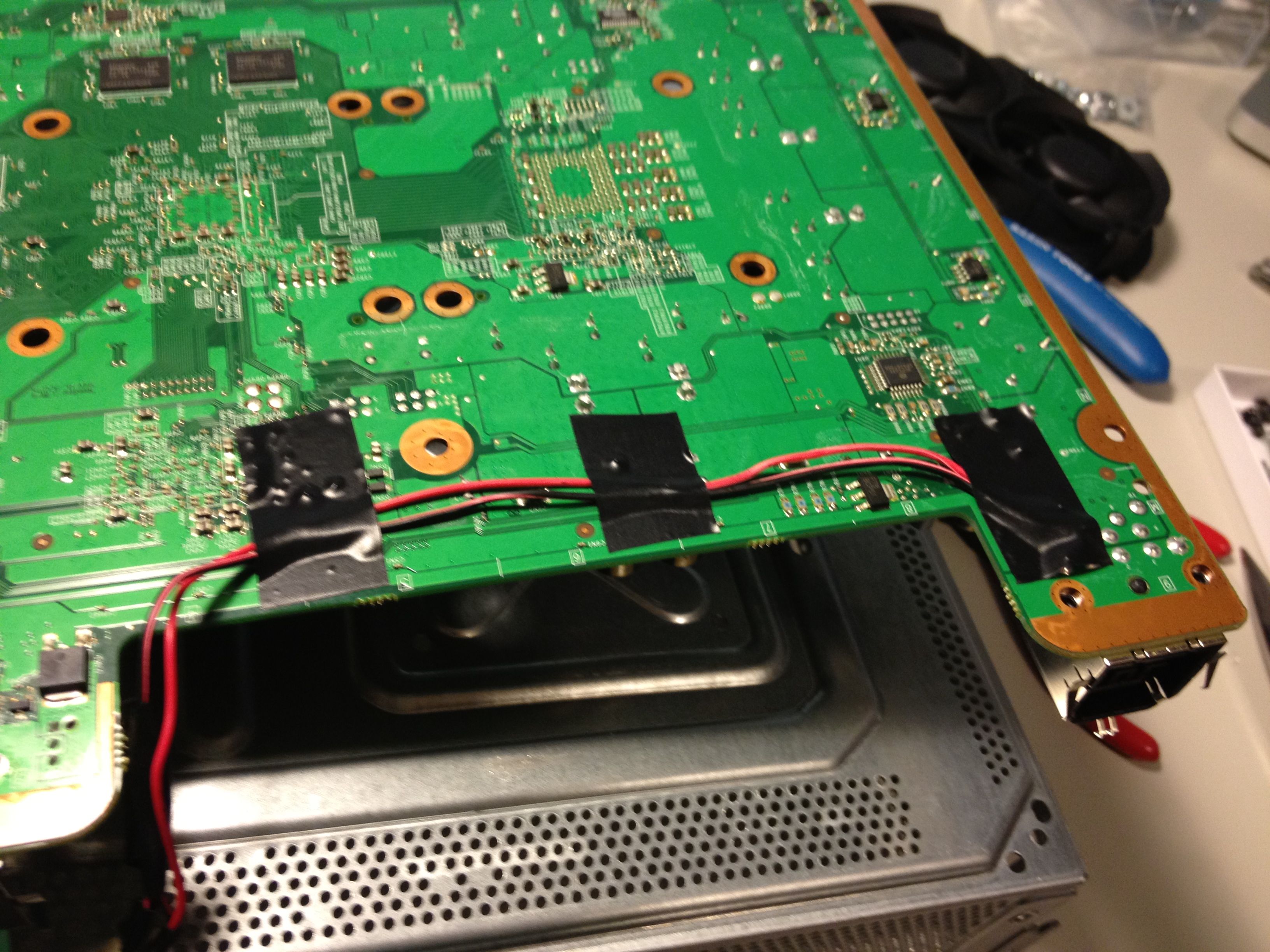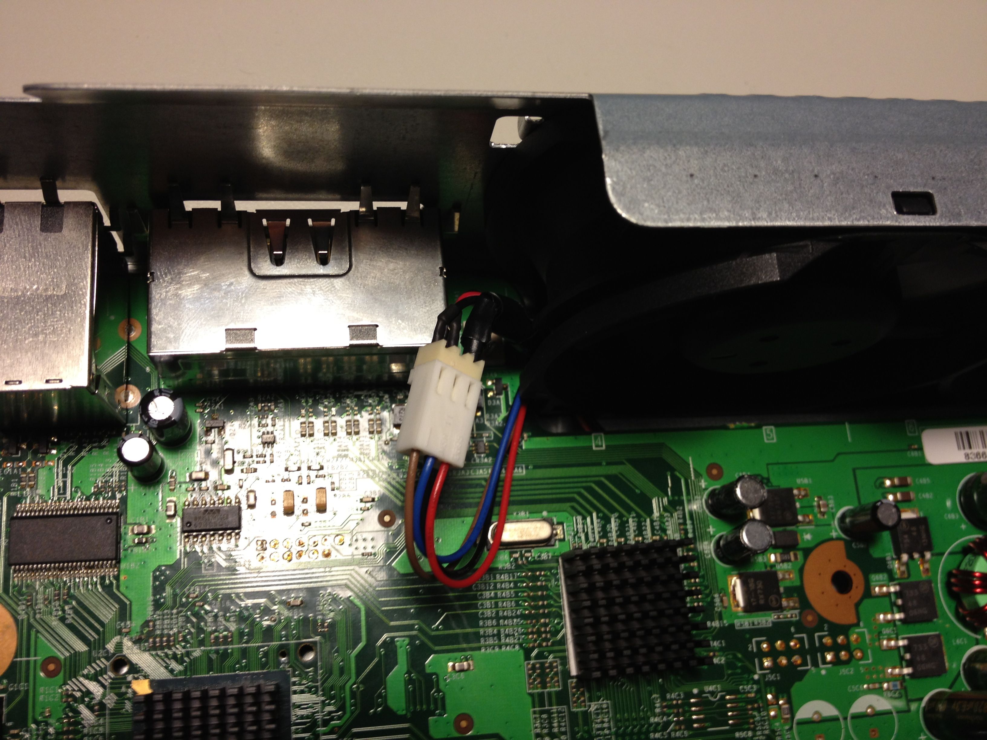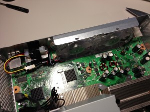 This is the 12V connector I added connected to the fans. I cleaned the dust off of all the components and installed the RROD kit per iFixIt’s instructions. In an effort to be more detailed the kit actually replaces the heat sink clamps with screws for a tighter connection and adds heat sinks to other chips. It’s a simple kit, but it really does make a difference. The tighter the connection the better the heat can flow.
