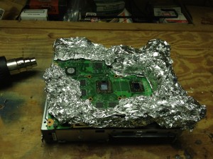 This is the setup for reflowing the solder. Due to the overheating sometimes the solder points on the chips become cold or lift all together. This is an effort to reflow the solder and to reinstate the connection. The foil is covering up all the components we don’t want to heat. The capacitors are especially sensitive to hear and can break if heated too much. This is an imperfect process as you can imagine so it’s just best to exercise caution. I heated the bottom of the board for 1 minute on low heat and then flipped it over and heated the top (pictured) for 1 minute on low then 4 minutes on high. I used sweeping motions on all the exposed chips making sure not to hold the gun still for the entire process. Afterwards it should be left to cool to room temperature before moved. This prevents the newly reflowed solder from moving.