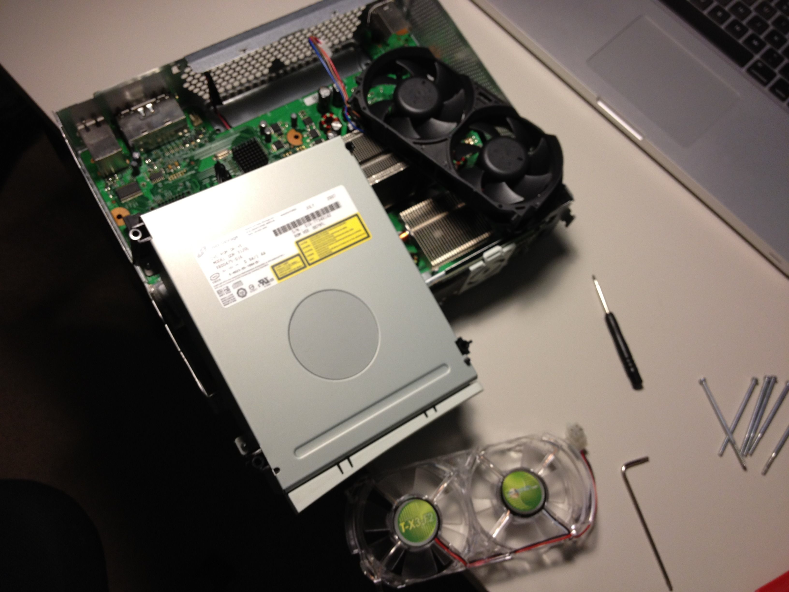 The new fans work! They actually are noticeably quieter. If their claims are true it should be much cooler as well. This is about all I plan to do to the internals of my Xbox and now it glows green, too, which, great!