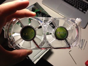 Here is what the new fan looks like. It has green LEDs in it that make it glow, which I could leave, but whatever, I care about performance.